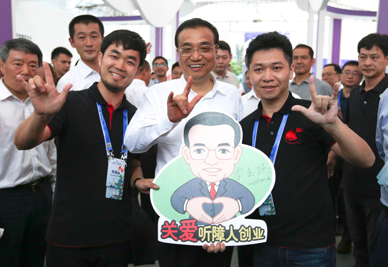 2016年10月12日下午全國雙創(chuàng)周深圳主會場上動人的一幕。李克強對這一創(chuàng)業(yè)團隊給予特殊關注,并應邀在“關愛聽障人創(chuàng)業(yè)”畫板上簽上自己的名字。(資料圖)