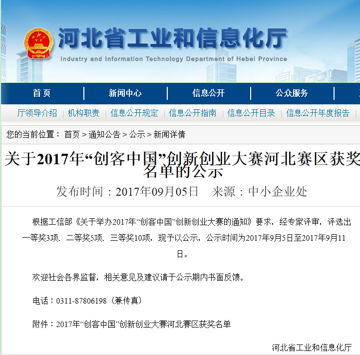 近日,河北省工信廳公布2017年“創(chuàng)客中國”創(chuàng)新創(chuàng)業(yè)大賽河北賽區(qū)獲獎名單,園區(qū)企業(yè)河北唯沃環(huán)境工程科技有限公司的“工業(yè)煙氣多種污染物深度凈化技術(shù)”獲得河北賽區(qū)三等獎的好成績。
